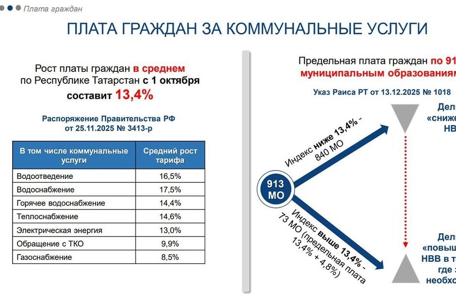 Гайнутдинов напомнил, что распоряжением федерального правительства средний индекс Татарстана был установлен в размере 13,4%, при этом предельно допустимое отклонение для граждан составляет 4,8%, а максимальное значение индекса для отдельных муниципалитетов может составить 18,2%. Для 840 муниципальных образований республики рост платы граждан не превысит 13,4%. Для 73 муниципалитетов — 24 городов, 17 поселков городского типа и 32 сельских поселений — индекс установлен с учетом предельного допустимого отклонения и составляет 18,2%.