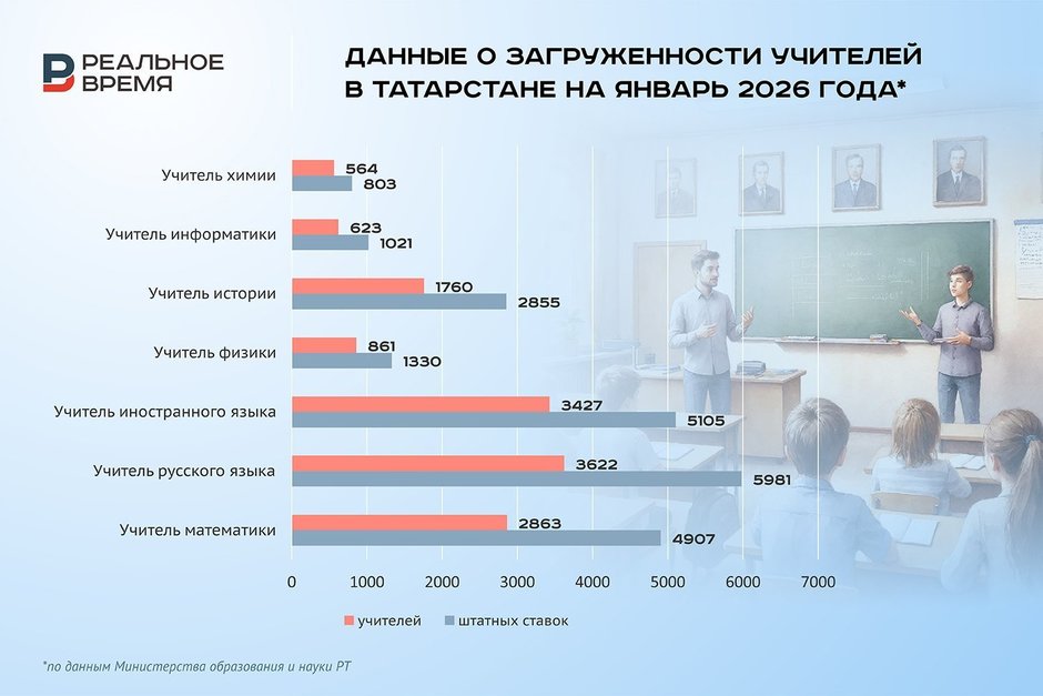 «Реальное время» поинтересовалось, какова на сегодня загрузка школьных учителей и как закрываются вакантные ставки. Из данных, представленных Ильсуром Хадиуллиным, нарисовалась не самая оптимистичная картина: средняя нагрузка учителей математики и русского языка — более 1,7 ставки, информатики и истории — более 1,6 ставки, иностранного языка и физики — более 1,5 ставки, химии — более 1,4 ставки.