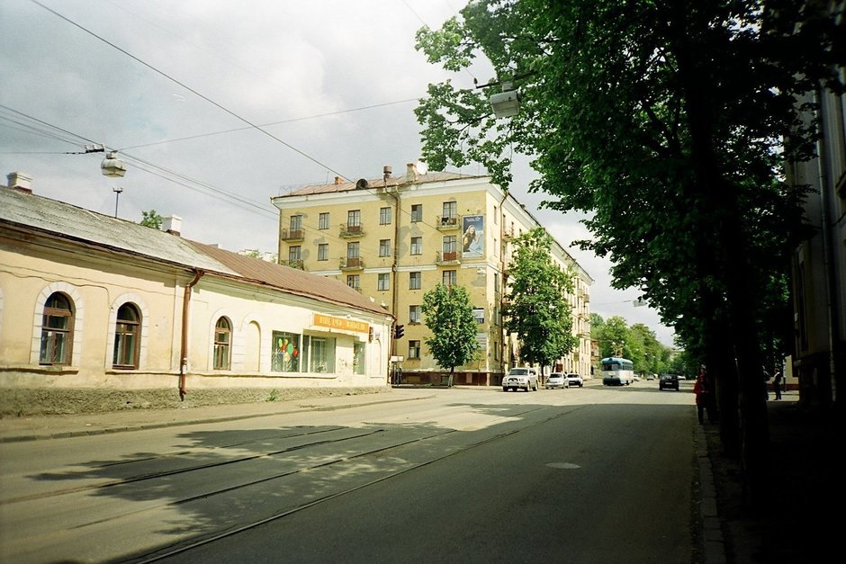 Трамвай на фото проезжает мимо магазина овощей и фруктов, а сейчас здесь кафе и ресторан. Это флигель усадьбы Лихачевых, основной дом стоит за углом на Муштари, тогда еще — улице Комлева. Строили его в середине XIX века, владела им Глафира Лихачева (Панаева).