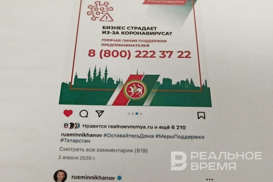 «Проект активно поддерживал и продвигал Рустам Минниханов — на мероприятиях, на Питерском экономическом форуме, встречах с федеральными гостями, в своих соцсетях. В 2020-м после его поста в сети был шквал звонков, — вспоминал в суде уже не обвиняемый журналист, демонстрируя скрин той публикации на страничке главы республики: «Бизнес страдает от коронавируса? Горячая линия поддержки предпринимателей 8 (800) 222 37 22». Никакой информации, что номер привязан к проекту «Проверенный бизнес», но при этом свыше 6 тысяч лайков, и 819 комментариев.