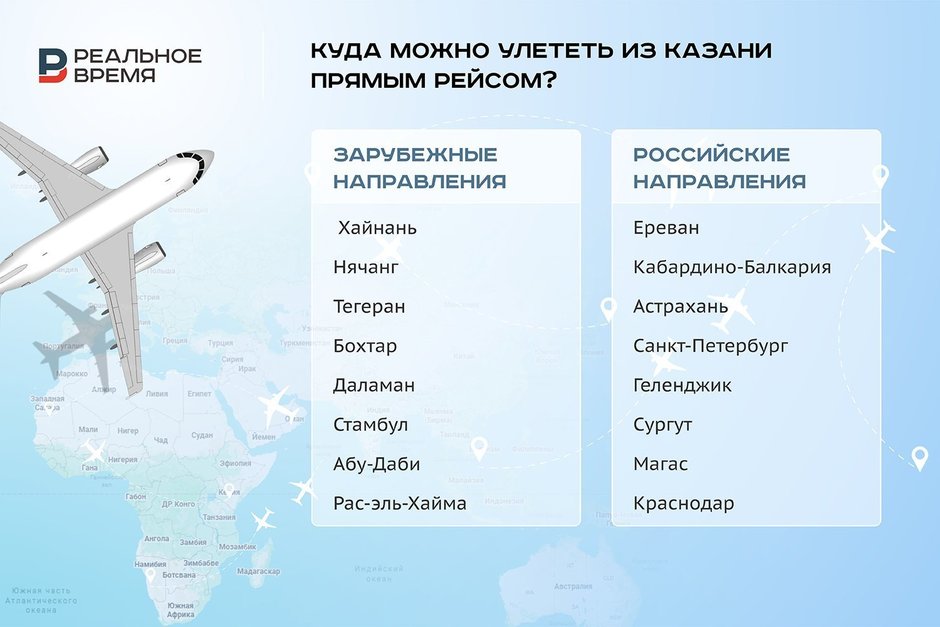 В 2025 году Казань связали прямыми авиасообщениями с 17 городами как внутри России, так и за ее пределами. Так, в марте возобновили рейсы в Ереван, с 1 мая запустили самолеты в Кабардино-Балкарию, а с 5 мая — в Астрахань. Кроме того, летом прошлого года Казань связали прямыми рейсами с Санкт-Петербургом, Геленджиком и Сургутом. Осенью самолеты начали летать из столицы Татарстана в Магас (Ингушетия) и Краснодар, следует из сообщений казанского аэропорта.
