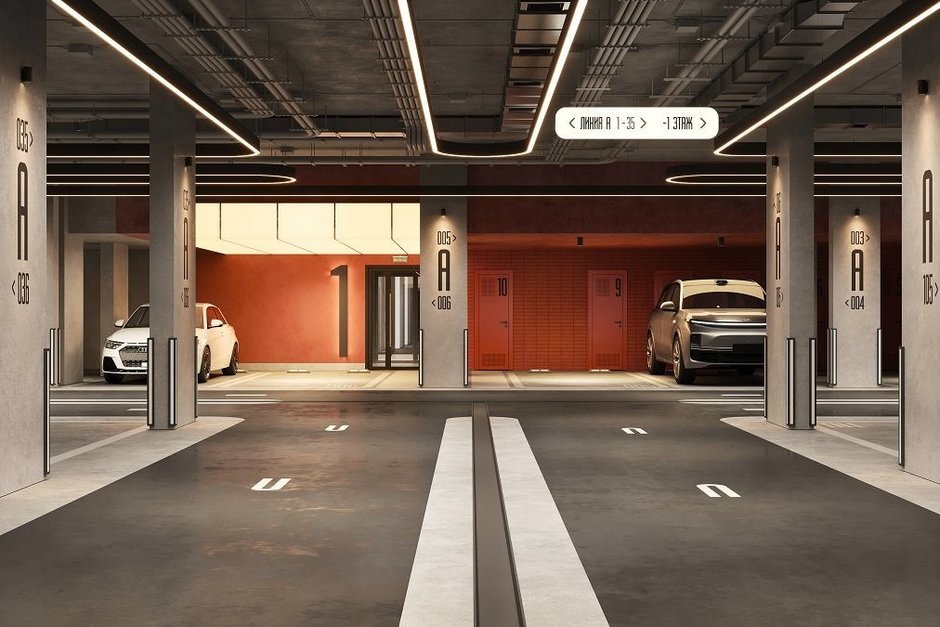 Пространство под стилобатом и первый подземный ярус займет парковка на 340 машин (для жильцов первой очереди ЖК). Она будет круглосуточно охраняться, оснащается высококлассной системой видеонаблюдения. А спуститься в нее можно будет прямо на лифте со своего этажа. Запроектированы расширенные машиноместа — такие пригодятся, если у вас есть мотоцикл или прицеп. Для электромобилей предусмотрено достаточное количество зарядных станций.