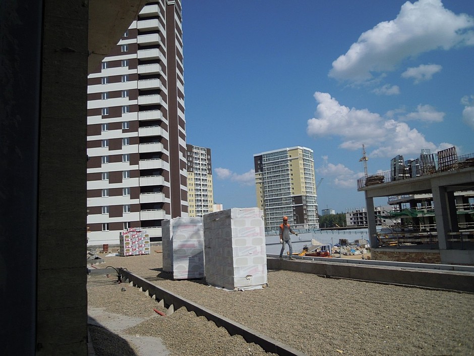 Затем вереницу зрителей потащили на «минус первый этаж» (сюда зашли «сильные якори» «М-Видео» на 1000 кв. м. и «Перекресток» на 1200 кв. м.). В компании заверяют, что не делают цокольный этаж каким-то, как обычно, «недоделанным» — «потолки под 4 метра!» (на 1 и 2 этаже — под 6 метров). На «минус первом этаже» также прямой вход на парковку (в проекте предусмотрена парковка на 600 мест надземных и 700 — подземных мест). Любопытно, что «синергия между ТЦ и жилыми блоками» происходит именно через «минус первый этаж», одна парковка, подземная, переходит в другую — надземную. Пока по то ли технической, то ли пожарной лестнице люди поднимались с «минус первого» на второй этаж, кажется, все будущие арендаторы и клиенты прочувствовали на себе, что такое шестиметровые потолки… На втором этаже традиционная для ТЦ зона фудкорта с кухнями (в т.ч. KFC), рядом с ней зона «Кидплейса» более чем на 1000 кв. м. (билеты от 450 рублей). В центре фудкорта планируют разбить детскую площадку для детей младше 4 лет. Здесь гид Анастасия тоже не скупилась на рекламу: турки заказывают «итальянскую красивую мебель» (для фудкорта), барные столешницы «из искусственного камня». Здесь же, на втором этаже планируется трехметровый мост, соединяющий зону фудкорта с кинотеатром. Вместо моста пока опять же неутомимые, как муравьи, турки, шмыгающие по гравию с тележками. Судя по темпам работы, за два с половиной месяца 750 турков могли бы построить и три подобных ТЦ… На крыше, прямо над фудкортом — компания разобьет «эксплуатируемую кровлю» на 3 тыс. кв. м. с дорожками, тротуарами и т.д. Сам «Санрайс-сити» не будет закрытым, что естественно (в противном случае заведомая убыточность того же ТЦ была бы обеспечена) и откроется в октябре для всех челнинцев, а не только для купивших квартиры в «Санрайс».