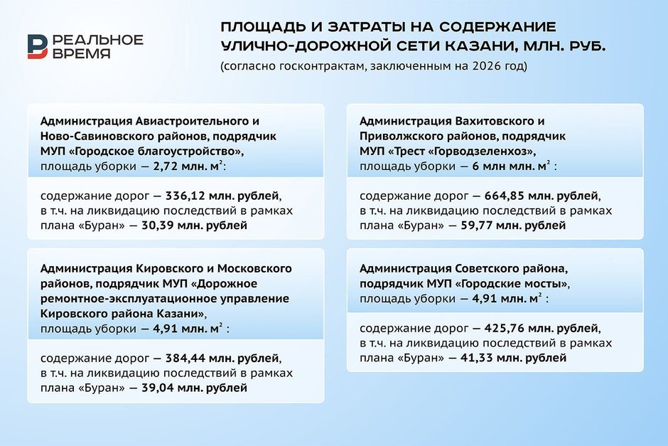 На сайте госзакупок «Реальное время» нашло данные о договорах, заключенных районными администрациями Казани с подрядчиками на 2026 год. Общая стоимость заключенных контрактов — свыше 1,8 млрд рублей, однако в этой сумме «сидит» также и летнее содержание дорог.