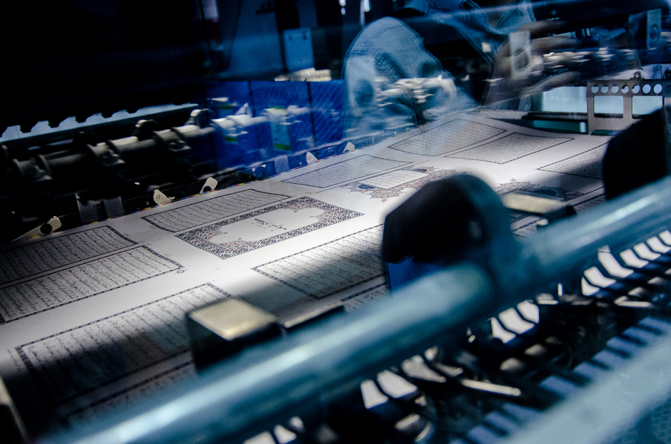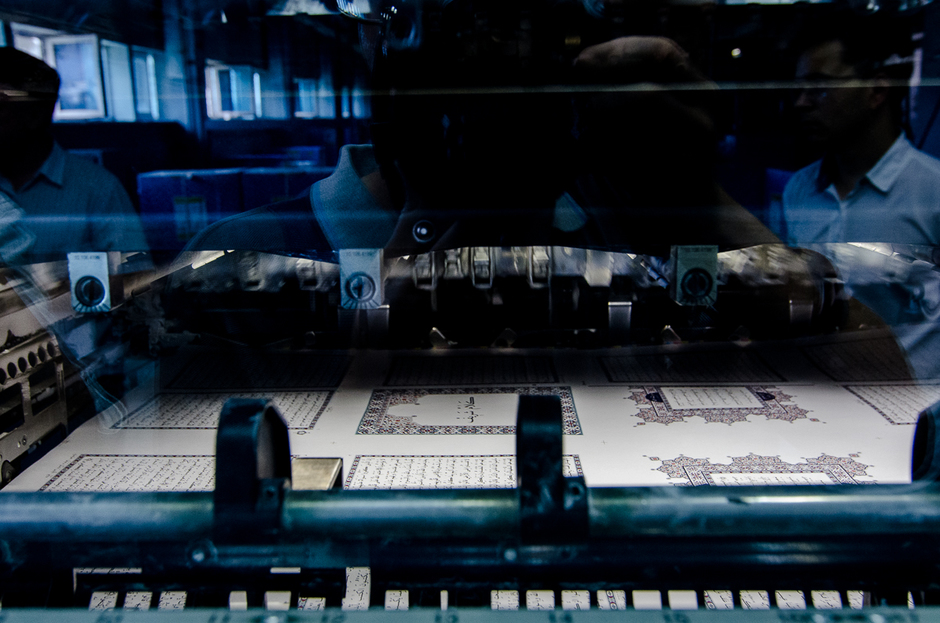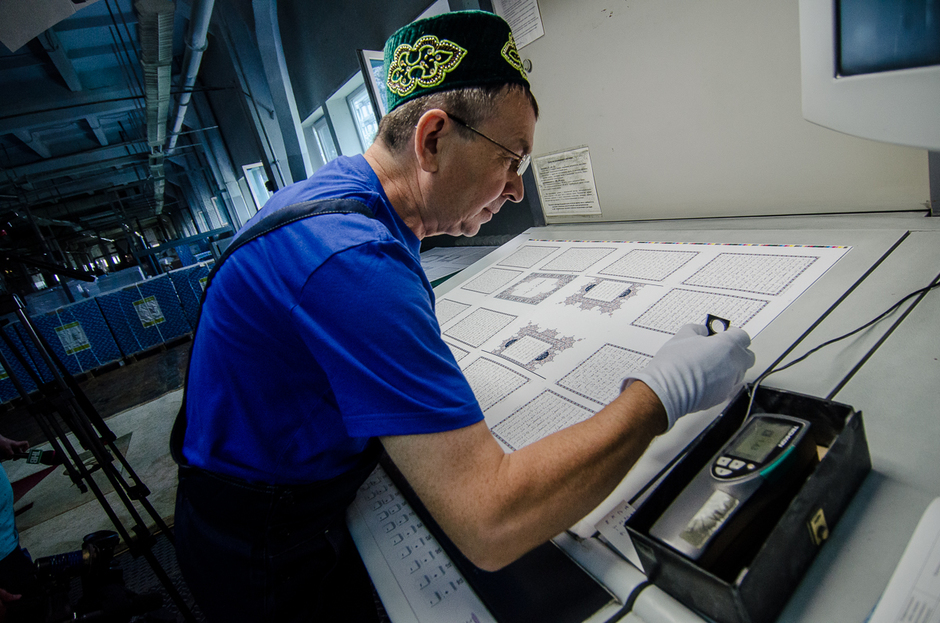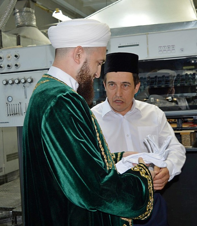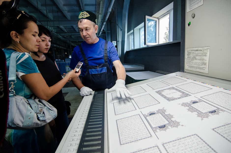 Он обошелся без долгих торжественных речей и перерезания красной ленточки. Вместо этого в цеху издательства «Идел-Пресс», где царила невообразимая жара, была прочитана молитва. После того, как голос начальника отдела по изучению священного Корана ДУМ РТ Ильнура Хайруллина прекратил разноситься по цеху, глава ДУМ РТ Камиль Самигуллин надел белые перчатки и нажал на кнопку пуска печатного станка.