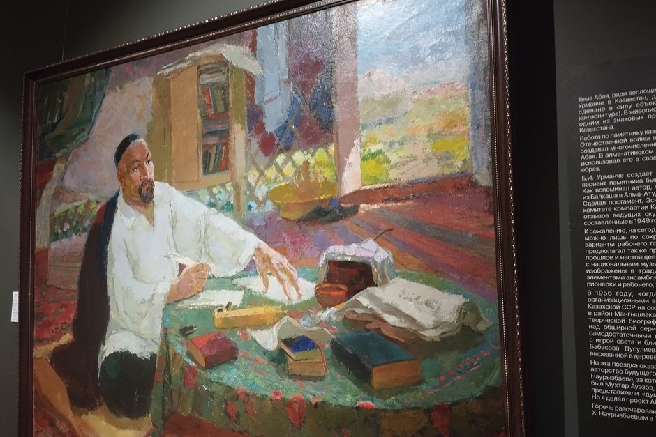 Отдельная тема на выставке — неудавшийся проект памятника казахскому поэту Абаю. Урманче создал несколько скульптурных проектов и вариантов памятника, но в итоге, пока он был по работе на Каспии, создание памятника поручили другому автору. Считается, что это также повлияло на решение художника покинуть республику. В 1956-м Урманче переехал в Ташкент, где начал работать в художественном институте и всерьез занялся скульптурой.