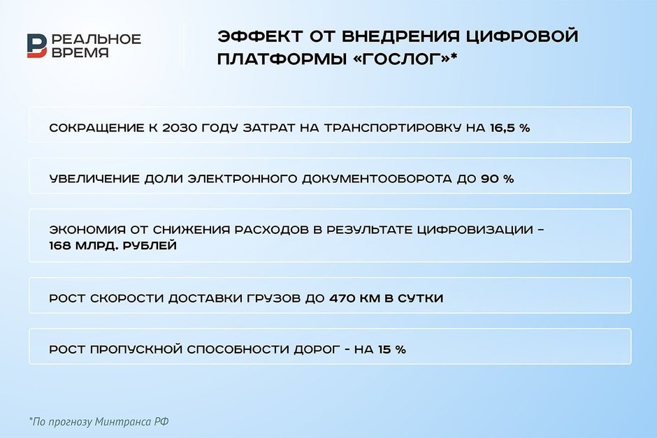 Также, по прогнозам Минтранса, экономия за счет снижения расходов на бумагу и оргтехнику составит порядка 168 млрд рублей, скорость доставки грузов достигнет 470 км в сутки, а пропускная способность дорог вырастет на 15%.