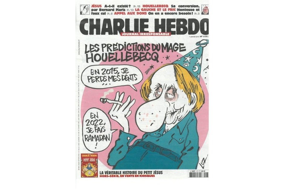 В тот же день, 7 января, на обложке сатирического журнала Charlie Hebdo появилась карикатура на писателя с подписью: «Предсказания мага Уэльбека: в 2015 году я потеряю зубы, в 2022 году я соблюдаю рамадан». Внутри номера был опубликован рисунок с заголовком «Пока все еще никаких терактов во Франции». В этот же день редакция журнала подверглась нападению. Были убиты 12 человек, среди них экономист Бернар Мари, друг Уэльбека.