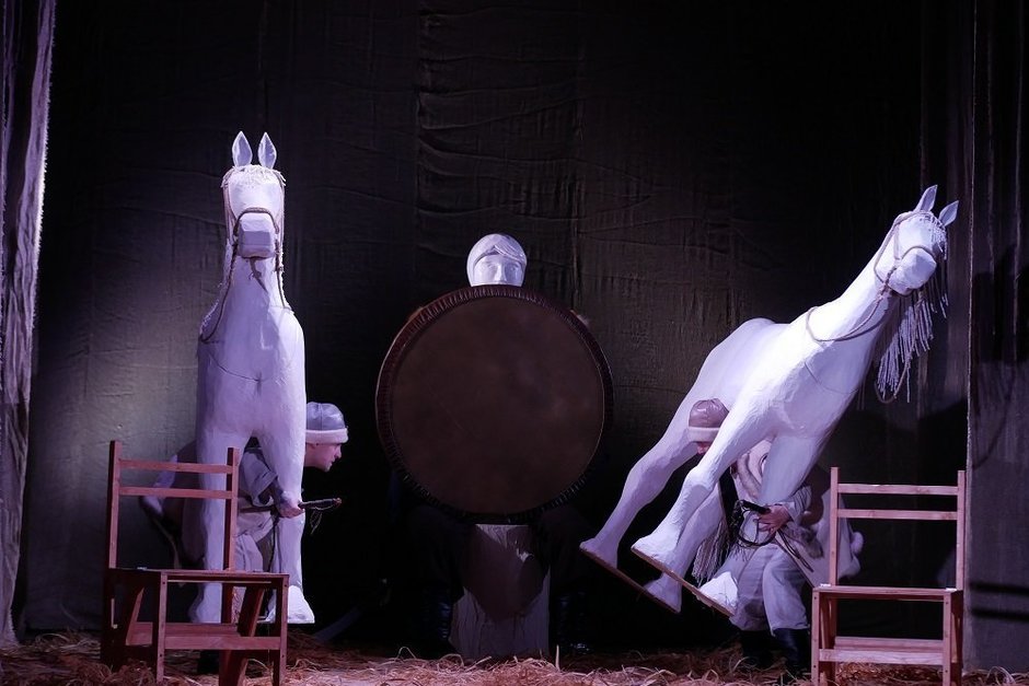 Фигура отца, хоть и оживает (впрочем, режиссер уже размышляет о другом варианте действий), изначально напоминает каменных истуканов, к примеру балбалов. И когда братья отправляют стрелы в щит на его груди (а дети в зале, наконец, притихают), хочется, чтобы это действие не было обыденностью — в попытке соревноваться братья заступают за черту, после которой уже нет возврата.