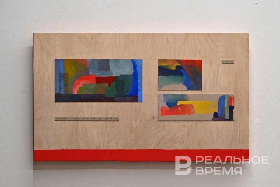 На том же этаже, но в другом зале разместилась меньшая по размеру, не выглядящая классической, но рифмующаяся с «узбекской» по ощущению безмятежности и набору красок выставка «Живопись» Саши Шардака. Сам он вспоминал, что в 2018-м на выставке в аэропорту уже оказывался рядом с Баки Урманче. Картины дополнены деревянными скульптурами, которые так и хочется подвигать по «линии горизонта».