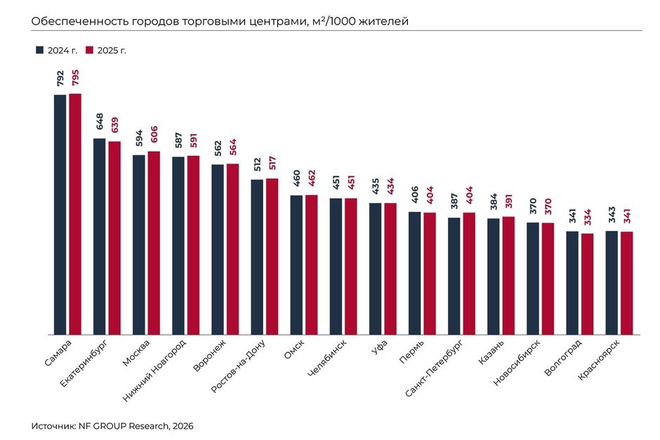 Уровень обеспеченности торговыми площадями в российских городах-миллионниках в минувшем году составил 487 кв. м на 1 000 жителей, что на 0,8% больше, чем годом ранее. Рост зафиксировали в восьми из пятнадцати крупных городов, в том числе в Казани (+1,7%), где показатель достиг 391 кв. м на 1 000 человек против прошлогоднего значения в 384 кв. м.