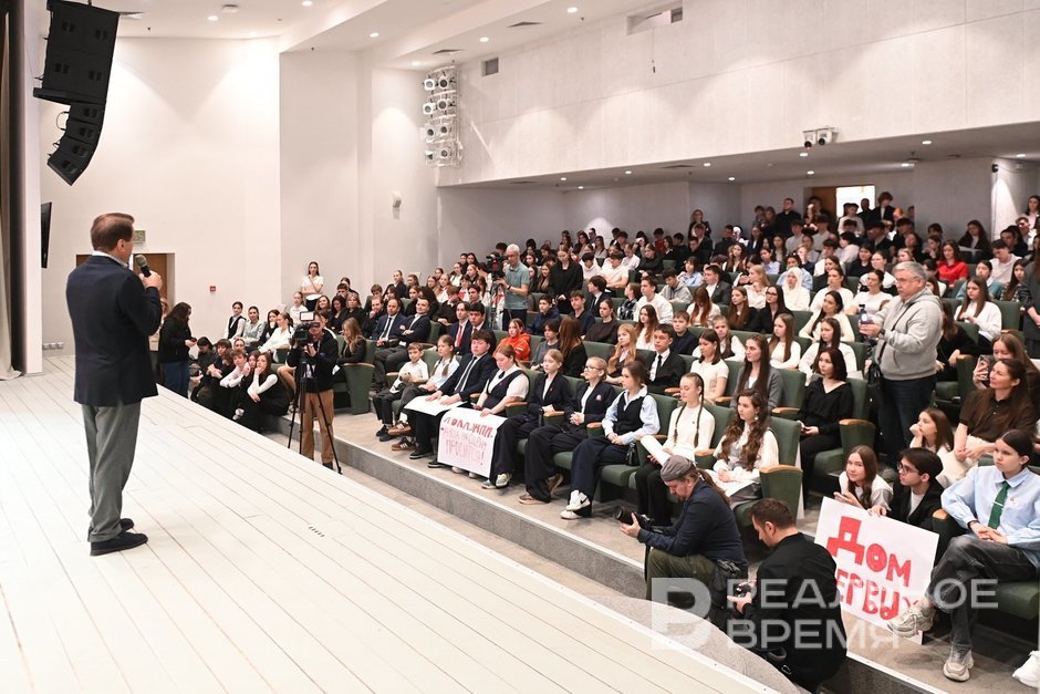 Сегодня центральный зал Нацбиблиотеки Татарстана был переполнен: десятки школьников с плакатами ждали встречи с Ильсуром Метшиным. Начали с самых актуальных для зумеров вопросов: мэр обратил внимание на постер с надписью «Верните Интернет!».