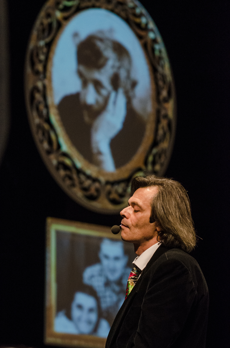 Оформление сцены было лаконичным — несколько венских стульев, черная одежда сцены, на заднике гламурненькие рамочки, в которые проецировались фотографии Аксенова. Зал был полон, и как только в нем появился мэр города Ильсур Метшин, вечер открытия фестиваля начался.