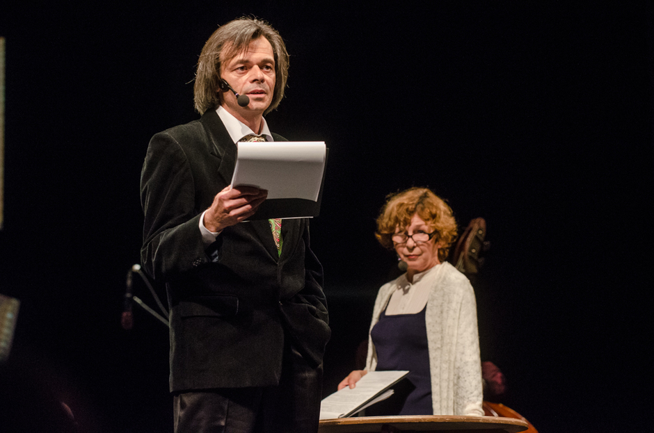 Первое отделение, которое шло почти два с половиной часа, состояло из выступлений гостей и участников феста, перемежаемое необязательными концертными номерами. Кроме этого, были показаны два длинных отрывка из спектаклей по произведениям Аксенова, которые были презентованы на предыдущих «Аксенов-фестах». Если сравнивать с вечером открытия фестиваля десятилетней давности, когда на сцене были действительно «звезды», то сравнение будет не в пользу вчерашнего действа.