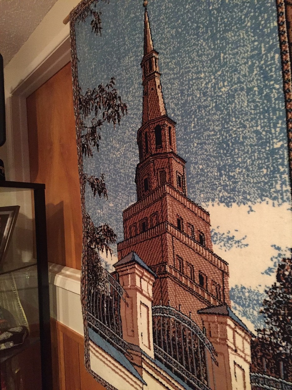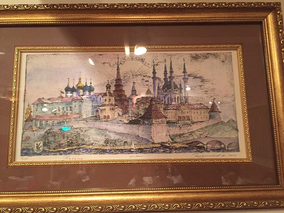В двух дальних углах зала, за стеклом были выставлены национальные татарские костюмы, тюбетейки, а также книги на татарском языке. Здесь же в углу я нашел большую тканую картину, на которой была изображена башня Сююмбике.