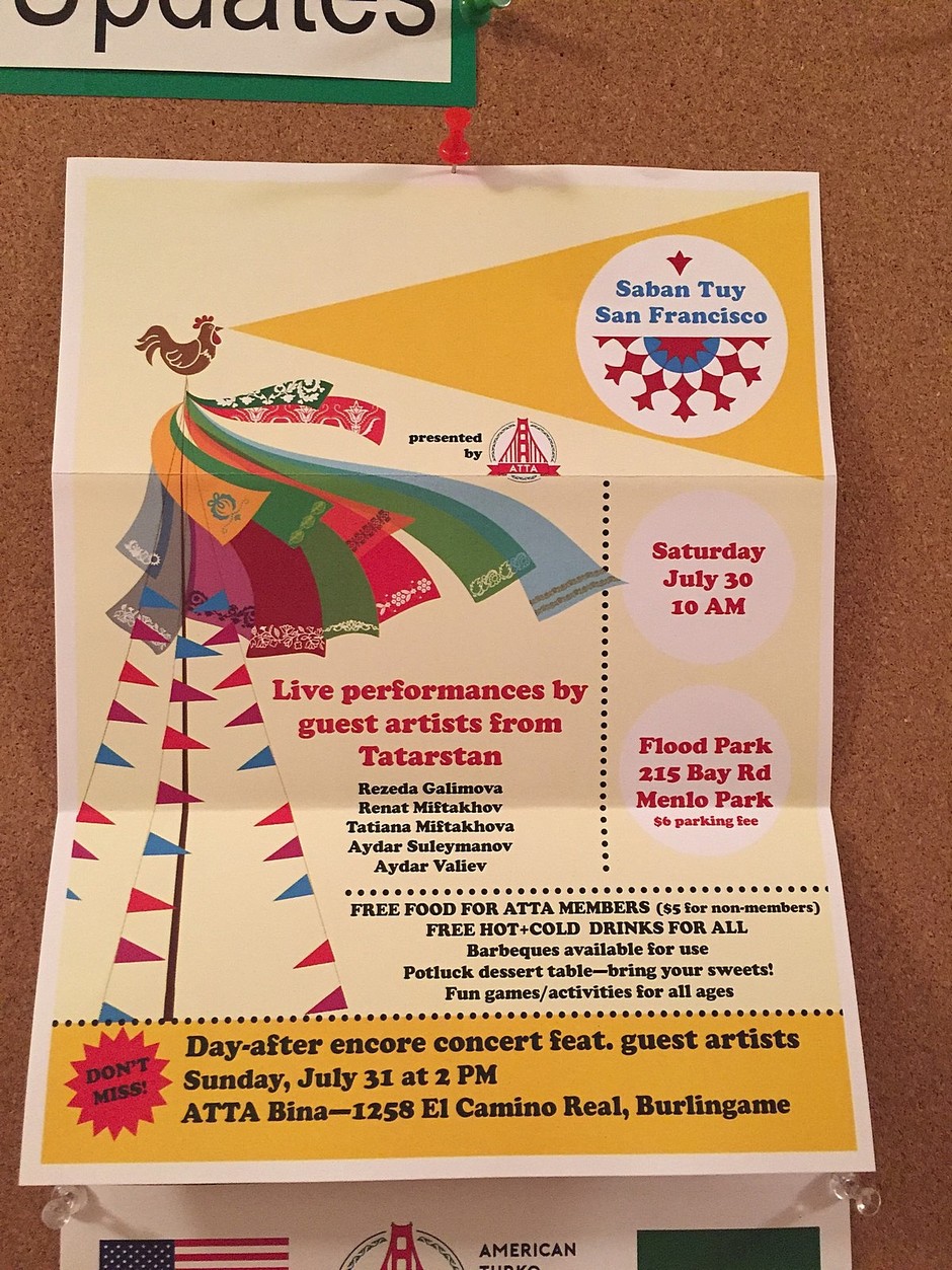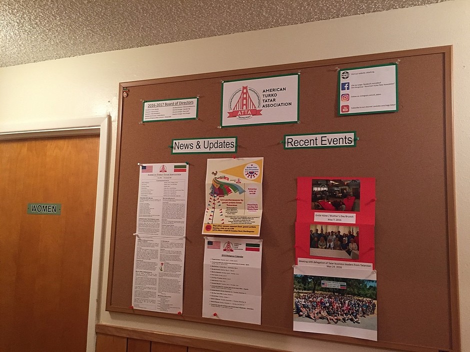 Пока ждали последних гостей и ставили дополнительные столы и стулья, я немного осмотрелся. По всему залу были развешаны фотографии, рассказывающие об истории становления татарской диаспоры в Кремниевой долине. На отдельном стенде в коридоре, ведущем в кухню, была размещена информация о мероприятиях, проводимых АТТА в этом году, с небольшими фотоотчетами: День матери и Сабантуй, а также запланированная на декабрь распродажа татарской выпечки.