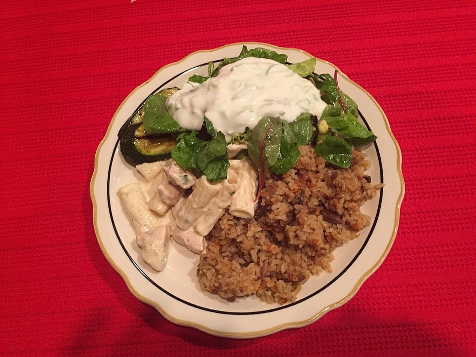 Пока я ходил по комнате, разглядывая стены и шкафы и делая фотографии, начали накрывать на праздничный стол. В качестве основного угощения был домашний плов, салат из овощей с листьями салата, жареные баклажаны, цацики, а также курица с макаронами в розмариновом соусе, приготовленная и подаренная одной из дружеских ассоциации некоммерческой организации.