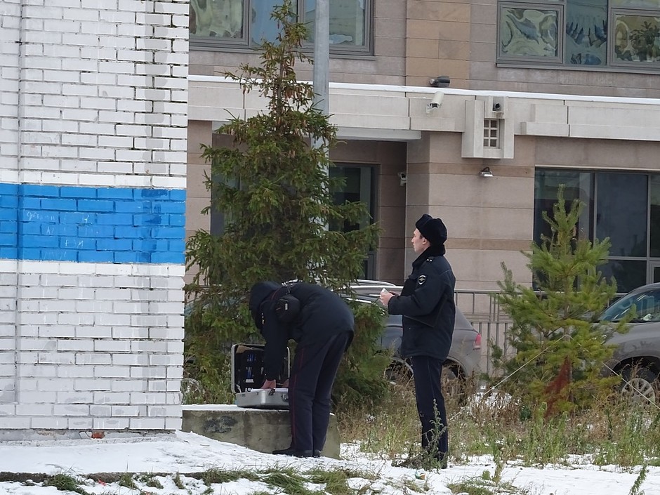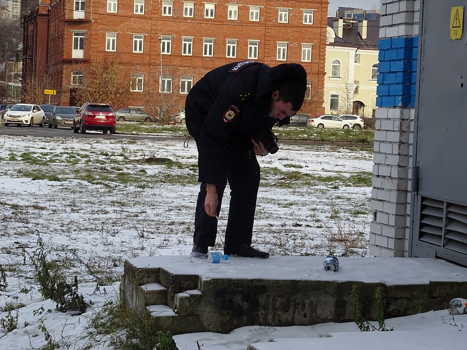 На место тут же выехали сотрудники следственно-оперативной группы. И на глазах корреспондента «Реального времени» вычислили предполагаемое место стрельбы — площадку у здания подстанции, примерно в двадцати метрах от здания суда со стороны улицы Островского. Именно там эксперт-криминалист обнаружил две пульки от пневматического пистолета. Также внимание полицейских привлекли пустые бутылки от пива, воды и колы, на которых могли остаться отпечатки пальцев и следы ДНК предполагаемого стрелка или стрелков.