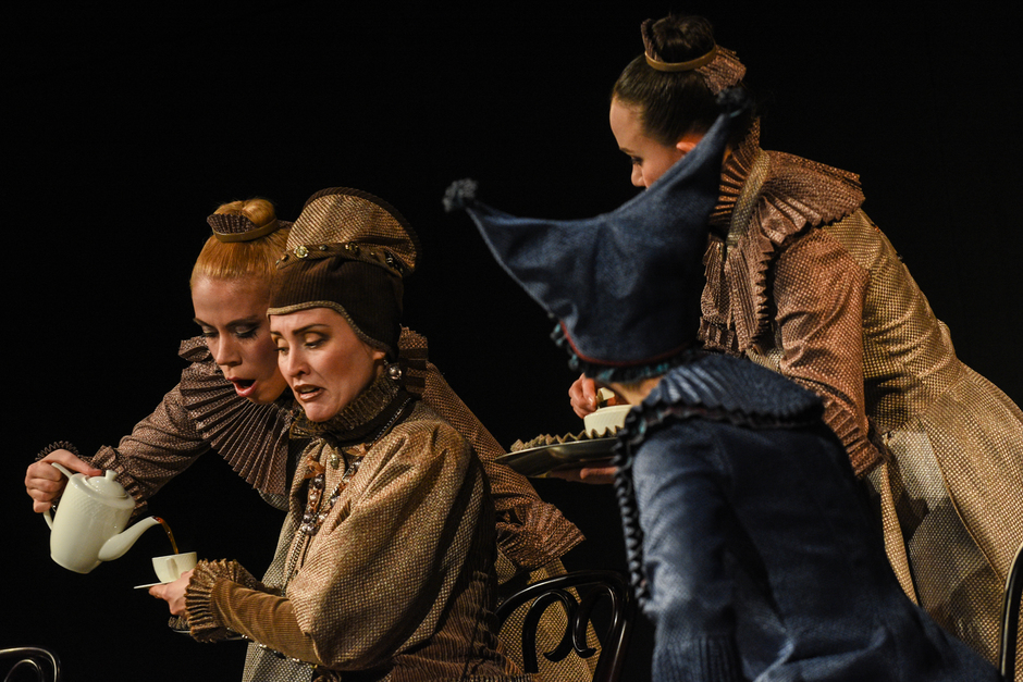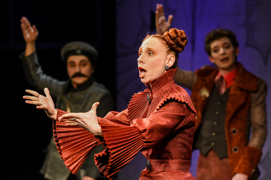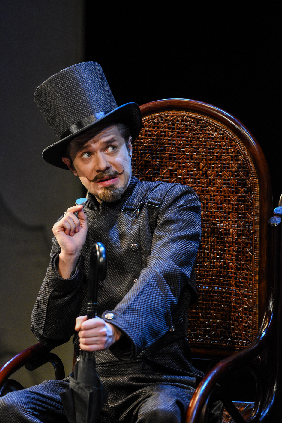 Костюмы в спектакле (художник Елена Четверткова) тоже условны, автор не копирует одежду определенного периода позапрошлого века. Обращает на себя внимание одна деталь — зонты, с которыми появляются персонажи. Это некий символ неустойчивости и неопределенности. Словно сейчас подует «ветер перемен», и в окно прыгать будет не нужно. Можно просто улететь. Улететь от этой скучной и какой-то нерадостной жизни.