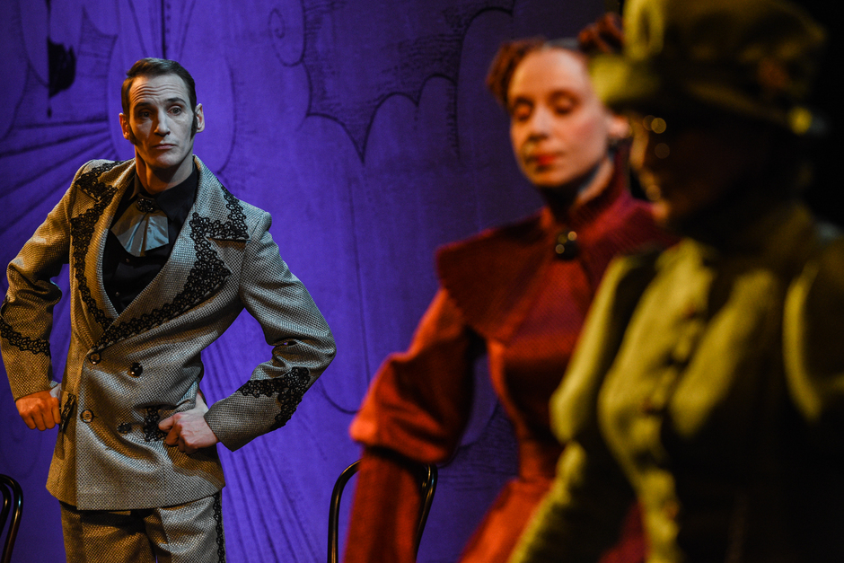 Когда он понимает, что нужно сделать шаг, что женитьба — это навсегда, и жизнь будет совсем иная, ему становится страшно, все новое пугает. Уж лучше позорно бежать — в окно, на извозчике за гривенник. Жаль, что Илья Петров не очень точно передает этот момент понимания угрозы новой жизни у Подколесина, этой привычной для него рефлексии. Впрочем, возможно, в последующих спектаклях ситуация изменится.