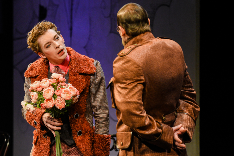 На малой сцене нет занавеса, и когда зритель входит в зал, в кресле-качалке мирно дремлет некий господин, закрыв лицо газетой, у ног его спит еще один. Это Подколесин (Илья Петров) и его слуга Степан (Владимир Леонтьев). Итак, кресло-качалка и разбросанные по полу подушки, а затем в доме у Агафьи Тихоновны несколько стульев — вот и все скромное оформление спектакля (сценограф Игорь Четвертков). Правда, есть еще задник, расписанный в духе Гоголя, то есть весьма фантасмагорично.