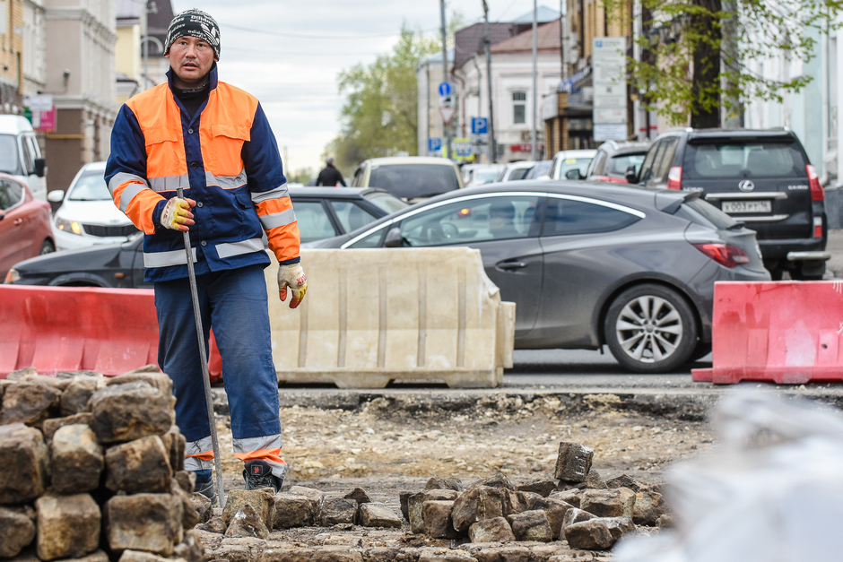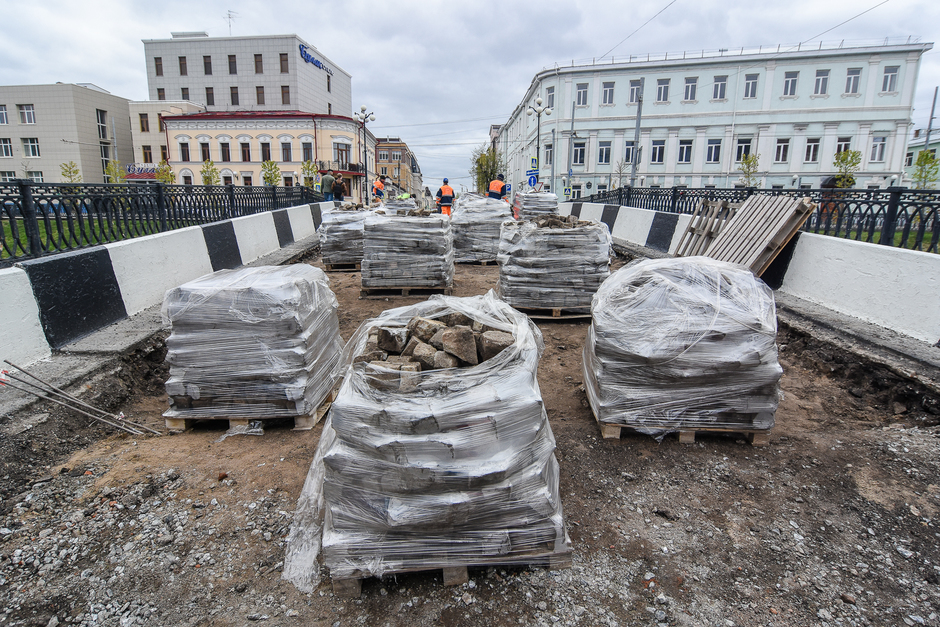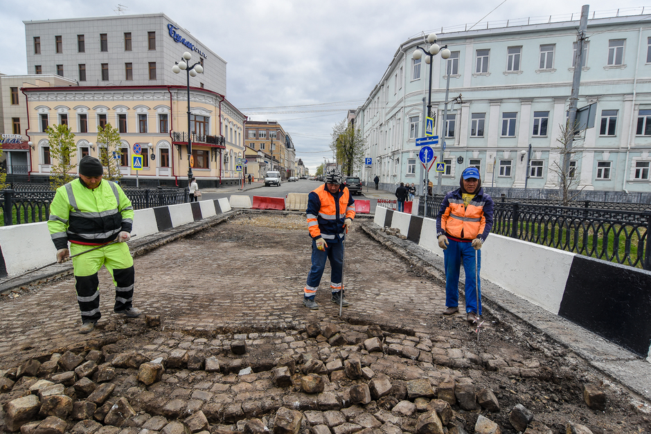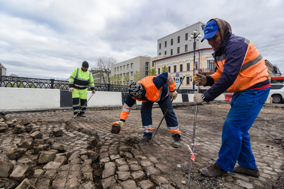 Корреспондент «Реального времени» отправился на место событий. Рабочие в форме «Каздорстроя» с помощью ломов откалывают брусчатку и складывают ее на деревянные подтоварники. На вопрос о том, что с брусчаткой будет дальше, один из рабочих говорит, что за ней приедет машина, а после они же будут ее промывать.