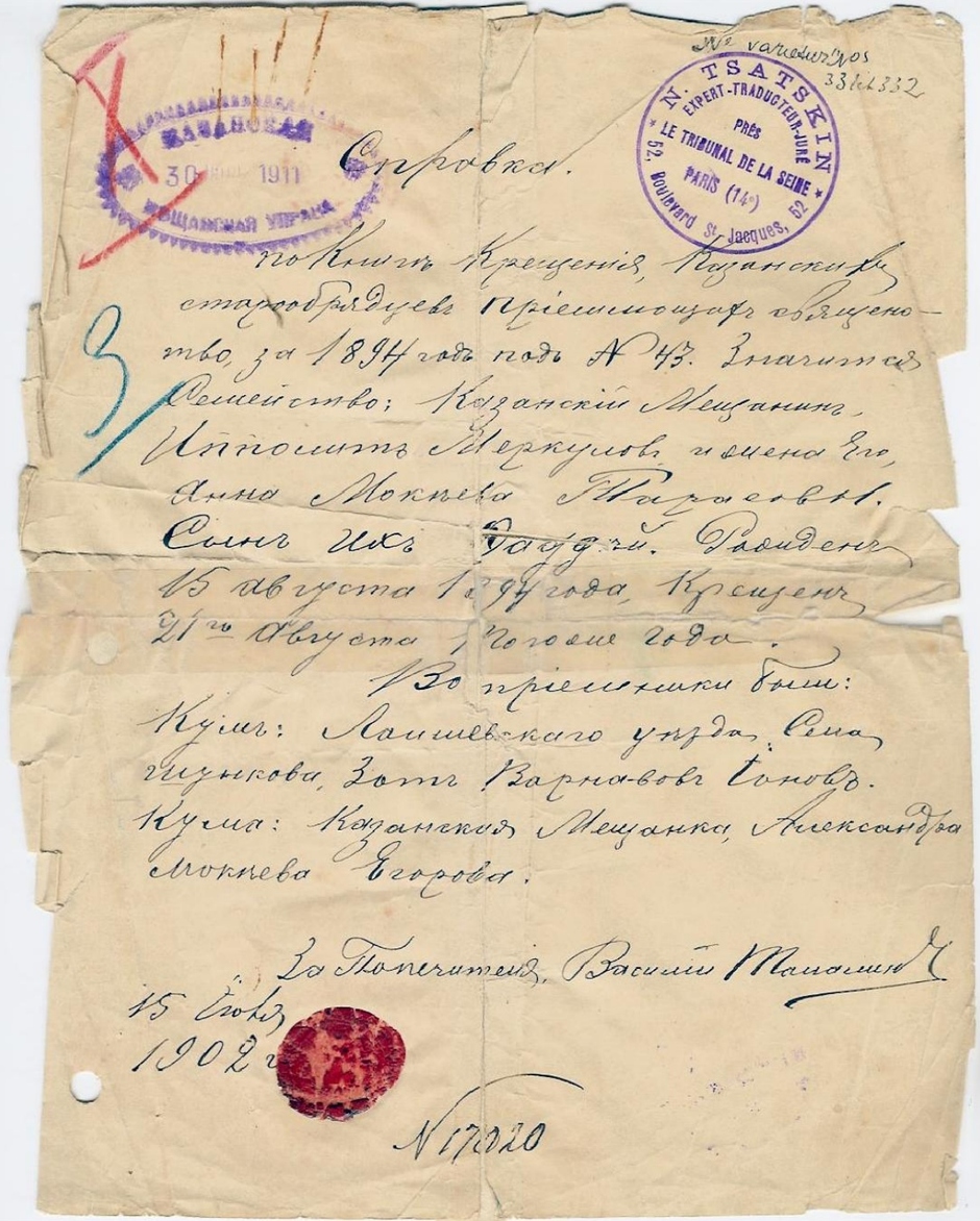 — Мой дед, Фаддей Тарасов, родился 15 августа 1894 года в Казани. Прадед, Ипполит Меркулов, был родом из хутора Верхний Услон (он из семьи фермеров). Прабабушка, Анна Мокеева-Тарасова, происходит из мелкой казанской буржуазии. Она умерла в 1911 году. В записях крещений старообрядцев Казани 1894 года («Закон №43») указывается, что Ипполит Меркулов и его жена, Анна Мокеева-Тарасова, 21 августа 1894 года крестили своего сына Фаддея, родившегося 15 августа того же года, согласно обрядам староверов Белокриницской церкви.