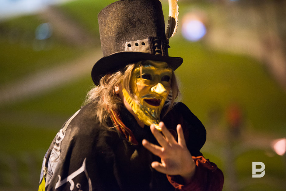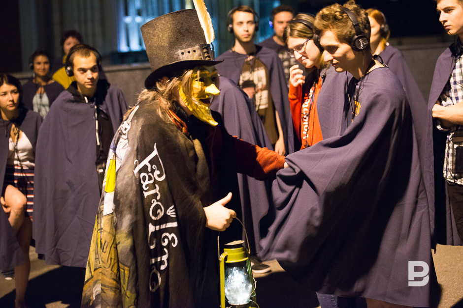 На часах 21.00, площадка перед Дворцом земледельцев полна народа, это и неудивительно в теплый летний вечер. Тот, кто хочет познакомиться с «Фонарщиком», должен занять место у зеленого дерева в центре фасада дворца. Здесь нас уже ждут люди в черных плащах и масках. На плащах надписи Farolero.