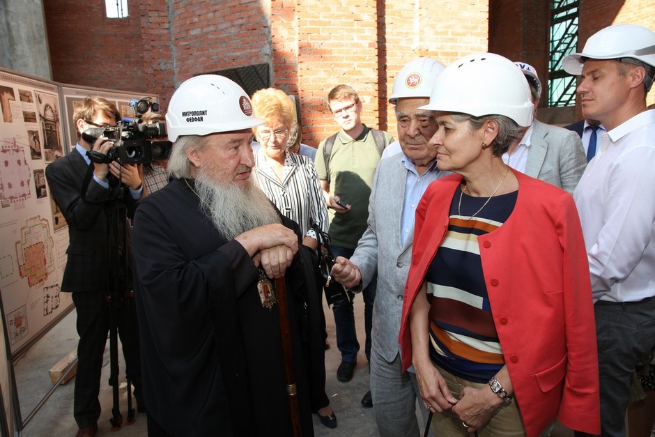 Собравшиеся продолжили просить сфотографироваться с Шаймиевым. К главе ЮНЕСКО верующие были равнодушны. Процессия направилась к восстанавливаемому собору Казанской иконы Божией Матери, который месяц ранее посещал предстоятель Русской православной старообрядческой церкви митрополит Корнилий (Титов). Троица и их свита остановились возле стенда с найденными на территории храма артефактами: керамическими обломками, осколками стеклянных сосудов, обломками кирпичей, монетами.