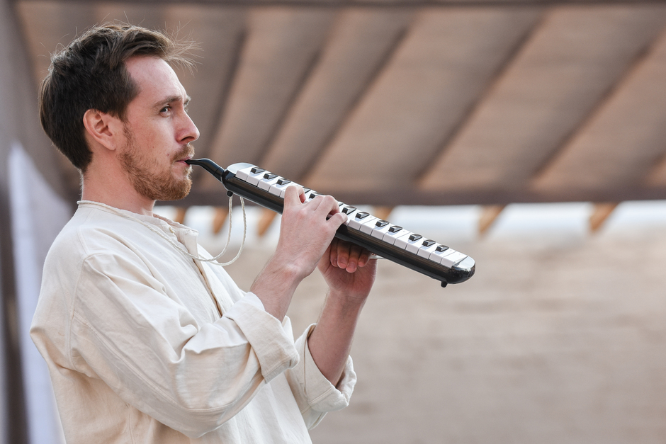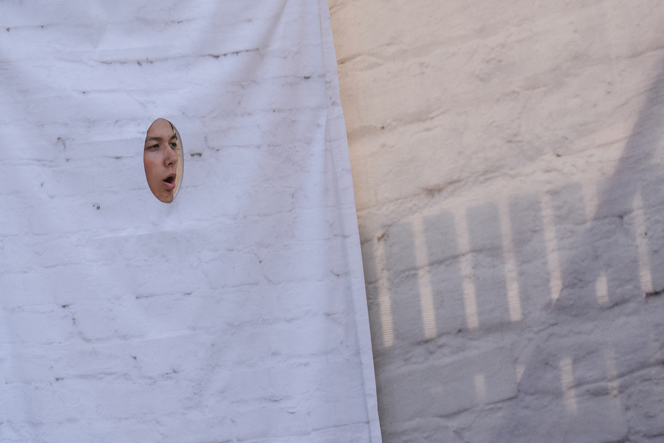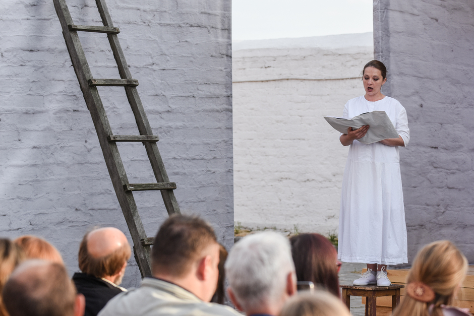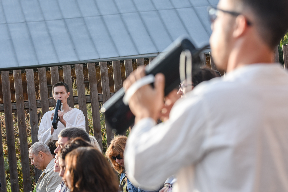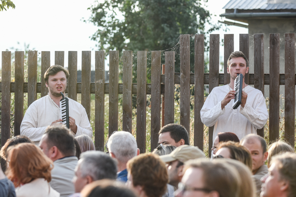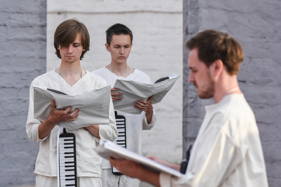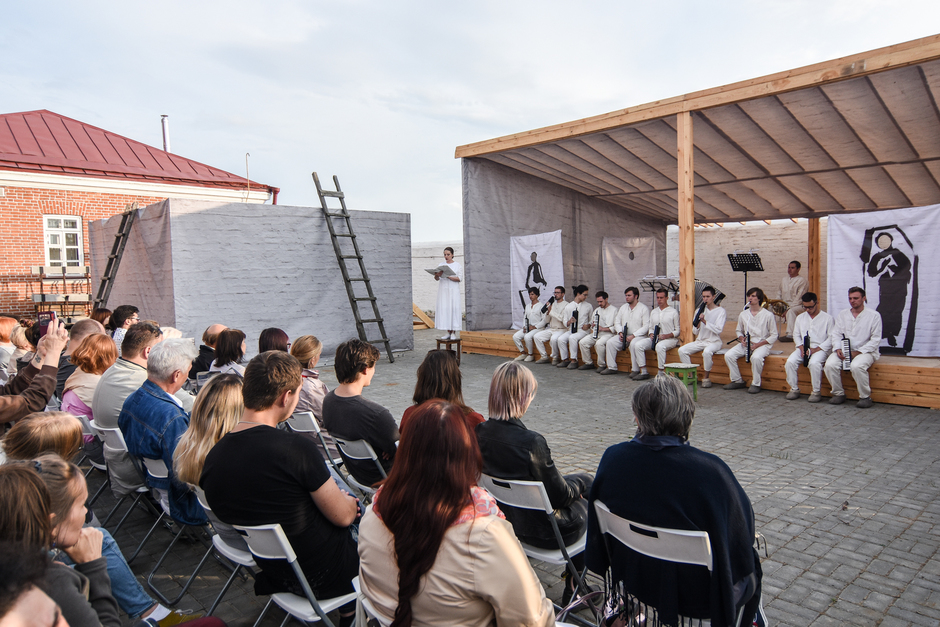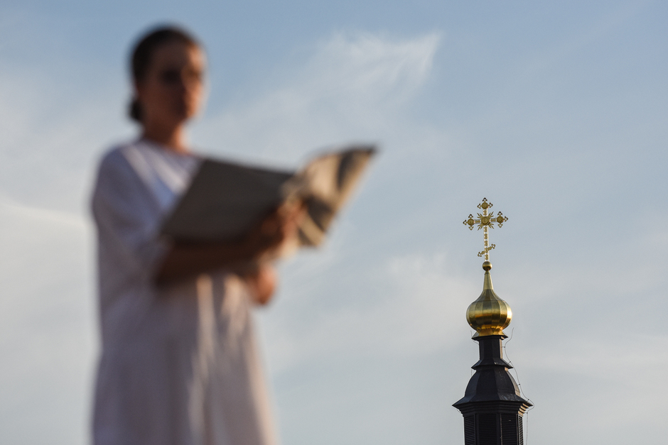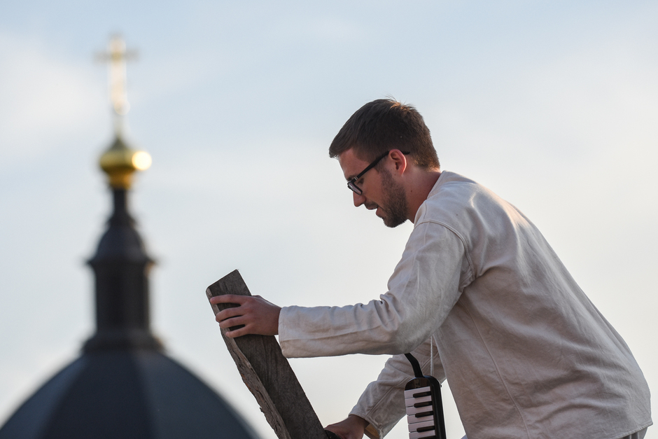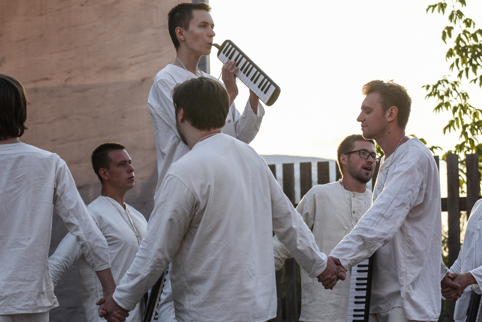 Реальность действительно врывается в ход спектакля — свияжское небо, неяркое, просвечивающее сквозь облака, опускающееся за горизонт солнце, предвечерний запах речной воды. Река почему-то особо остро пахнет свежестью ближе к вечеру, словно отдает аромат напитанной солнечным светом влаги. И — молодые люди с гармониками в белых одеждах неожиданно превращаются в конвоиров, они идут и планомерно пересчитывают нас, зрителей. Становится не по себе.
