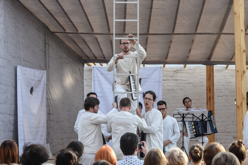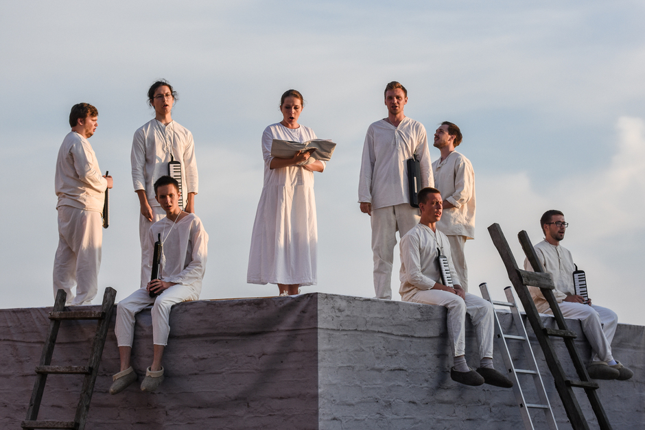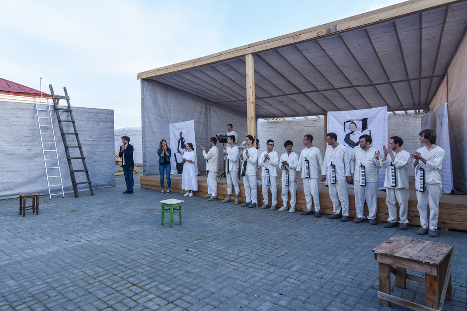 Помост с крышей, примыкающие к стене, несколько бумажных планшетов, на которых изображен стол, кровать, гроб, два табурета и, конечно, две деревянные лестницы. Оркестра как такового нет, нет и дирижера. Участники спектакля именуются «Голоса и гармоники», кроме этих мужских голосов, по ходу спектакля перевоплощающихся то в заключенных, то в надзирателей или пациентов психушки, есть еще один женский голос — сопрано. Есть и аккордеон, и валторна. Исполнители — молодые казанские певцы и музыканты. Все они одеты в одинаковые белые костюмы.