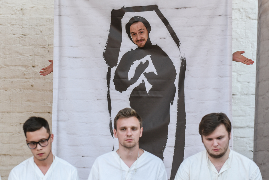 Спектакль начинается с продолжительного музыкального вступления, впрочем, оно не кажется длинным, потому что музыка диктует определенный душевный настрой. А дальше мы слышим многократно повторяемый, словно эхо в пустой церкви, поминальный список с реальными именами насельников Свияжского монастыря — монастырский синодик. Реальное место действия таким образом указано.