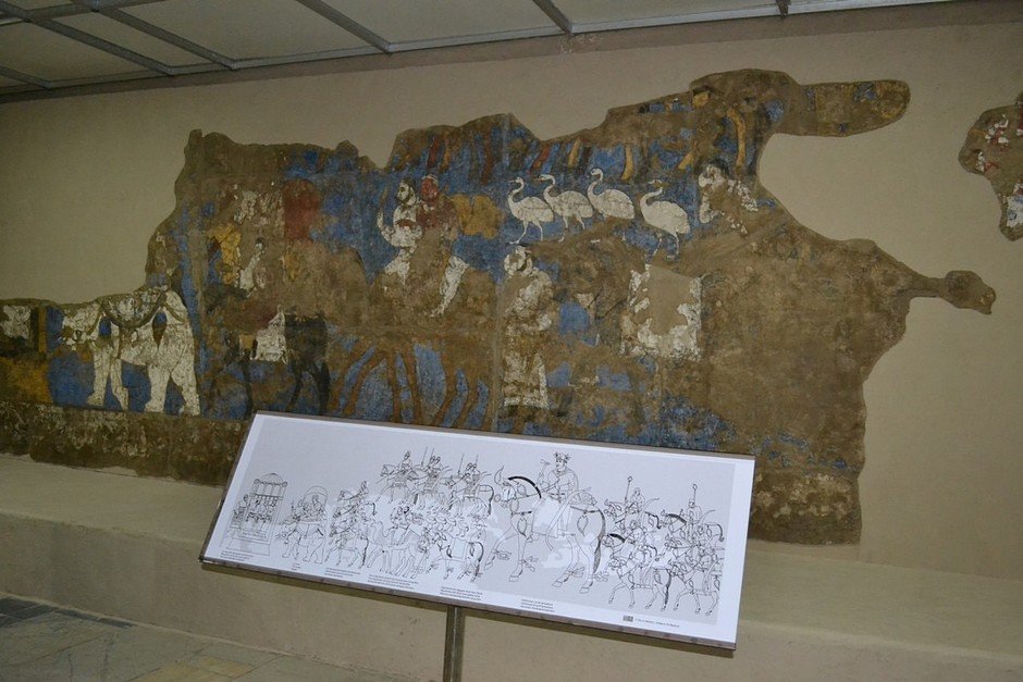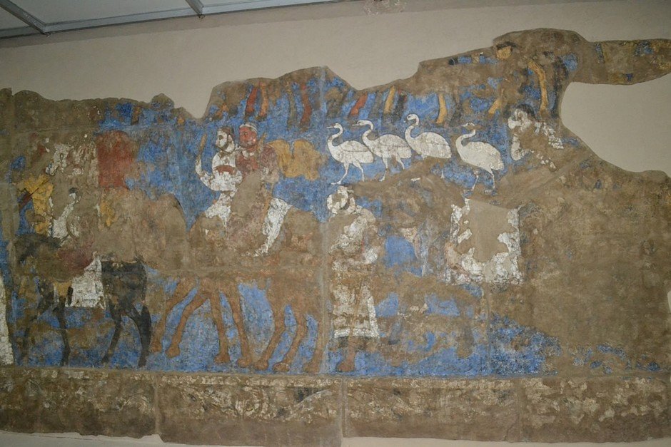 В небольшом кинозале под медитативную музыку монотонный дикторский голос пересказывает странный диалог между царем Вархуманом из рода Унаш и Чаганианским дапирпатом по имени Пукар-зате. После Чаганианского дапирпата слово берет Чачский дапирпат. Судя по именам, этот диалог мог происходить где-то во вселенной «Звездных войн» или полузабытого блокбастера «Дюна». Но нет, все это было здесь в VII веке нашей эры. Странные географические названия и имена расшифрованы на одной из фресок из царского дворца. Подлинные фрески выставлены в музее Афросиаба. На синем фоне различимы фигуры всадников на верблюдах и слонах. Рядом тянут шеи жертвенные гуси. Китайская императрица из династии Тан плывет на лодке в сопровождении придворных дам. Самарканд известен всем уже тогда.