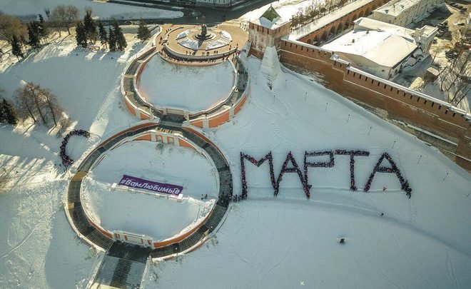 Праздничный флэшмоб нижегородцев к 8 Марта попал в Книгу рекордов Гиннеса. Более 700 мужчин во главе с губернатором Нижегородской области Глебом Никитиным, мэром Владимиром Пановым выстроились возле Чкаловской лестницы, которая по форме напоминает огромную восьмерку, чтобы «живой открыткой» поздравить женщин с праздником. Огромная надпись «С 8 Марта» была зафиксирована с квадрокоптеров.