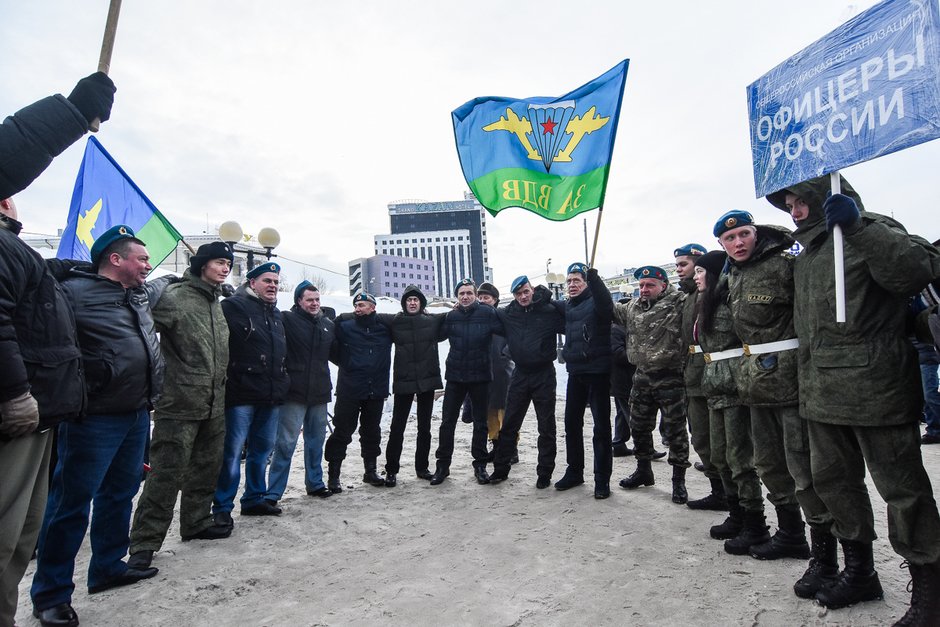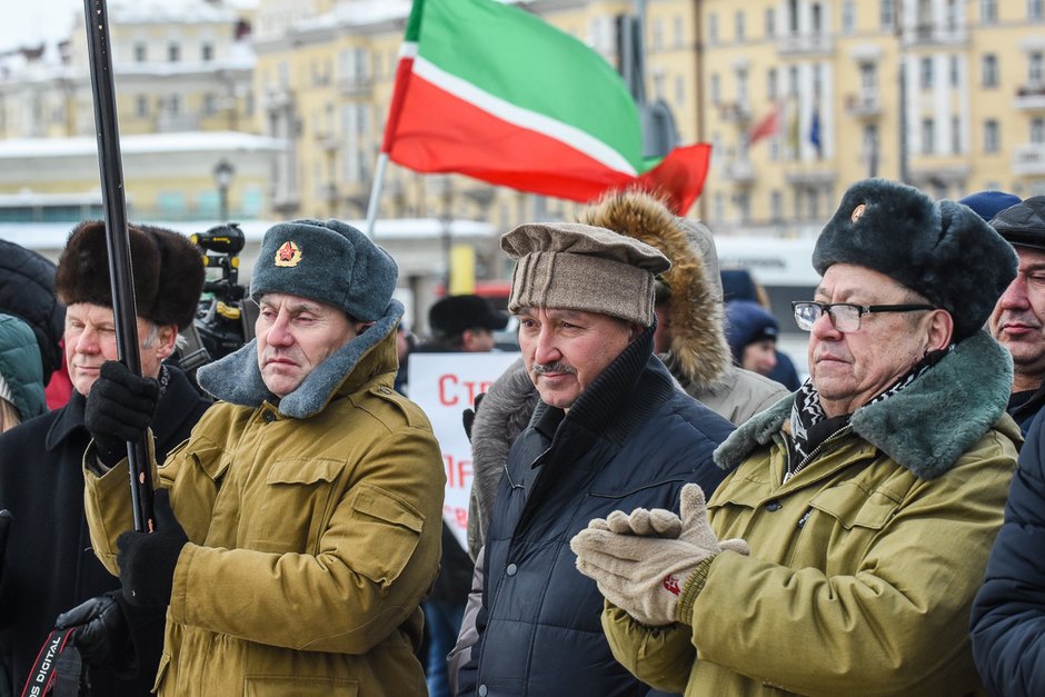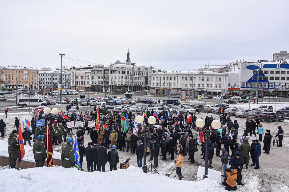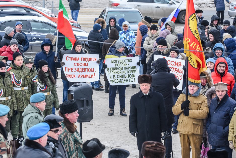Сегодня в Казани прошел митинг в поддержку президента РФ Владимира Путина. Несколько сотен бывших военных собрались на площади у памятника Муллануру Вахитову. Мероприятие было организовано руководителями региональных ветеранских военно-патриотических организаций «Офицеры России», «Союз десантников», а также Российского союза ветеранов Афганистана. К митингу присоединились и другие армейские сообщества.