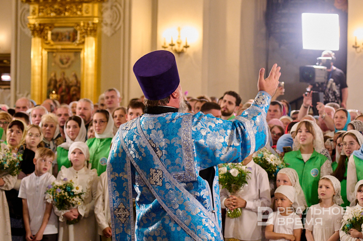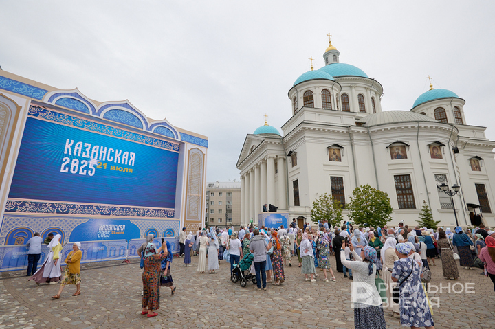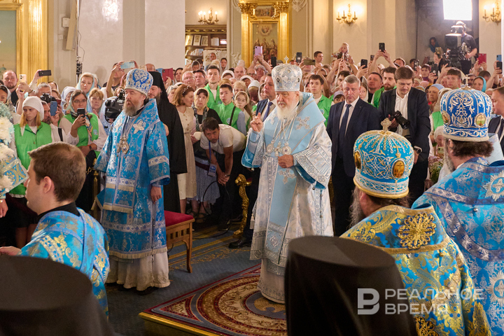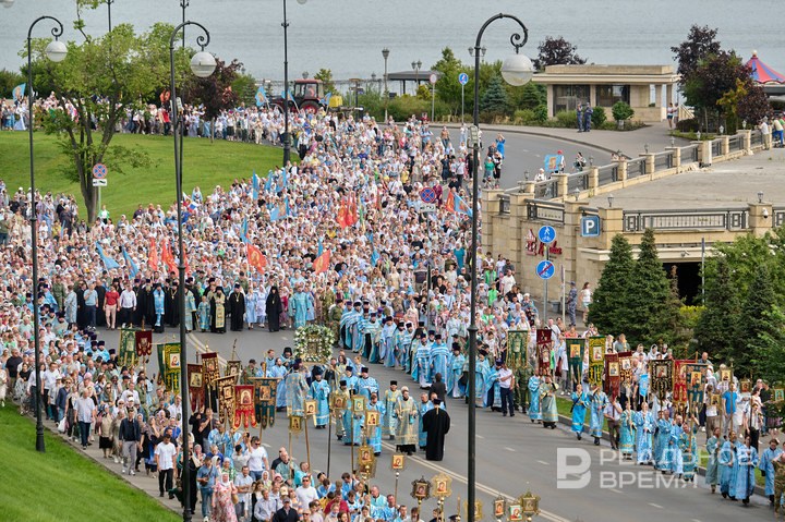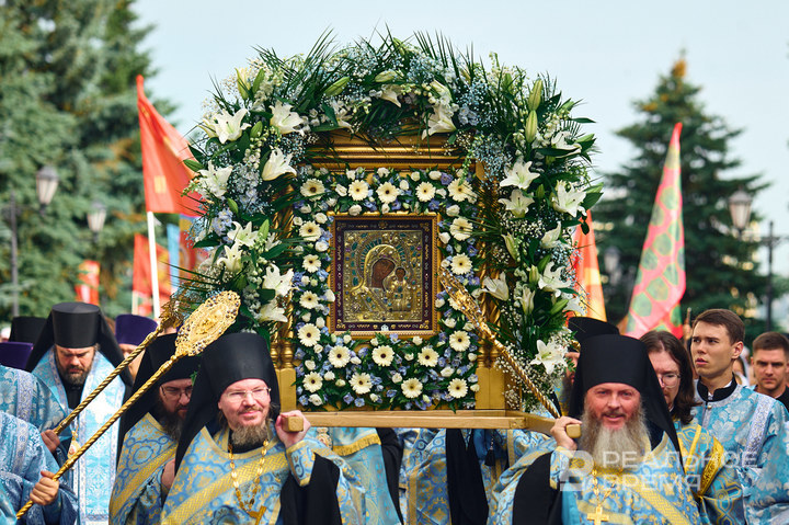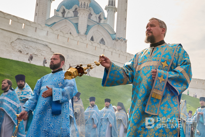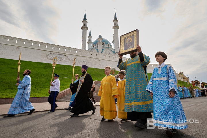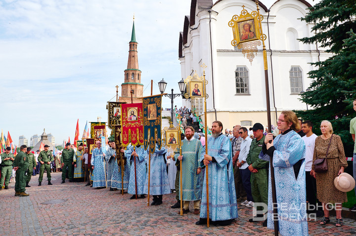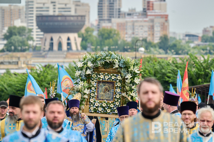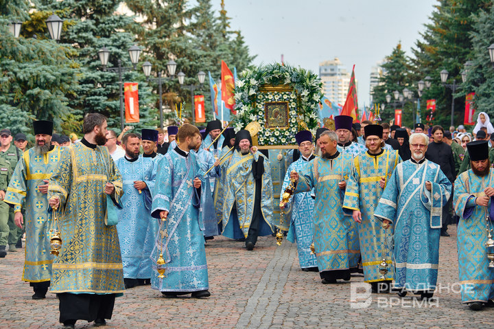 21 июля в Казани прошел традиционный крестный ход с Казанской иконой Божией Матери в честь 446-летия ее обретения. Чтимый список иконы пронесли от Благовещенского собора Казанского кремля до Богородицкого монастыря, где в 1579 году был явлен чудотворный образ. Затем в соборе Казанской иконы Божией Матери состоялась Божественная литургия. Богослужение возглавил святейший патриарх Московский и всея Руси Кирилл. Он вручил раису Татарстана Рустаму Минниханову орден Русской православной церкви Славы и Чести первой степени — один из самых редко присуждаемых орденов РПЦ. Также они возложили цветы к могиле митрополита Феофана, расположенной за алтарем собора. Главные кадры с торжественных мероприятий — в фоторепортаже «Реального времени».