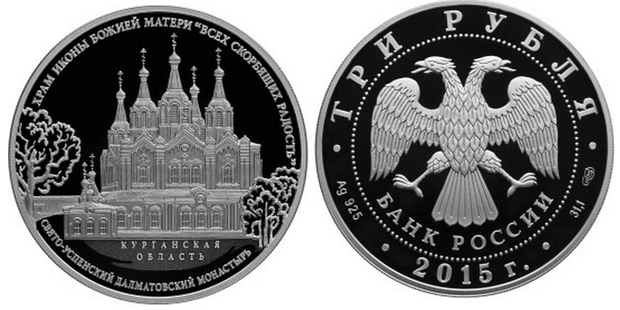 Первая монета — три рубля — будет частью серии «Памятники архитектуры России». На ее оборотной стороне будет изображен Храм иконы Божией Матери «Всех скорбящих радость» Свято-Успенского Далматовского монастыря. Монету выпустят тиражом 3 тыс. штук, говорится в сообщении на сайте Центробанка.