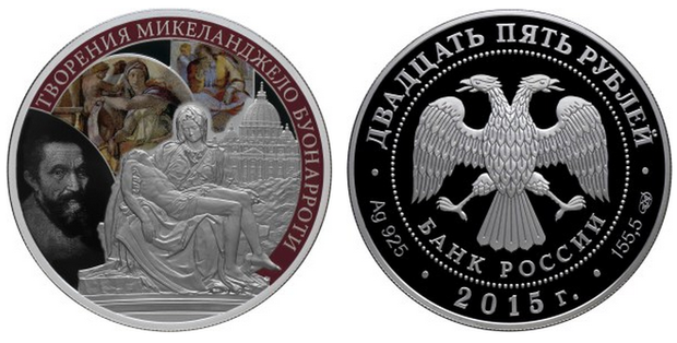 25-рублевая монета будет частью серии «Сокровищница мировой культуры». На ее оборотной стороне изображены скульптура «Пьета» и фасад собора Святого Петра в Ватикане в Риме, в цвете выполнены изображения росписей сводов Сикстинской капеллы в Ватикане в Риме. Также представлен фрагмента портрета Микеланджело Буонарроти. В оборот поступит 1 тыс. таких монет.