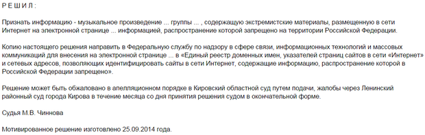 24 сентября 2014 года Ленинский суд Кирова еще раз признал эту песню экстремистской. Он уведомил об этом Роскомнадзор и потребовал внести в реестр «запрещенных» сайт, где была размещена песня. Что это за ресурс – непонятно, в тексте решения на сайте суда его название заменено на точки.