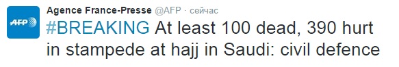 Не менее 100 человек погибли при давке в долине Мина близ Мекки. 390 человек пострадали.