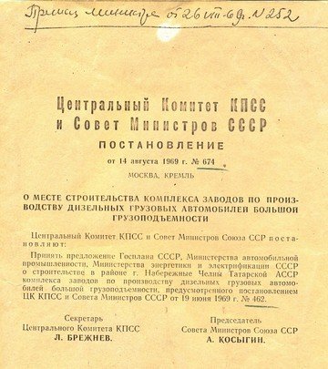 Пресс-служба ПАО «КАМАЗ» опубликовала фотографию постановления №674 «О строительстве комплекса автомобильных заводов в Набережных Челнах Татарской АССР», подписанного 14 августа 1969 года — 50 лет назад.