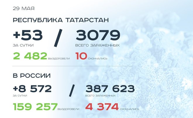 Всего в Татарстане зарегистрировано 3 079 случаев заболевания. Выздоровели за весь период 2 482 человека, из них 132 — за прошедшие сутки. Смертельных случаев — 10.