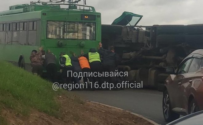 В Казани опрокинулся груженный песком КАМАЗ. Об этом сообщают пользователи соцсетей.