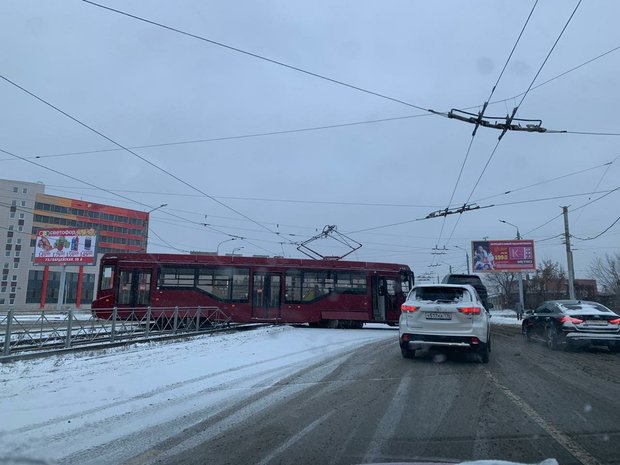 В Казани сегодня утром на улице Гвардейской с рельсов сошел трамвай. Фото «Реальному времени» прислали очевидцы.