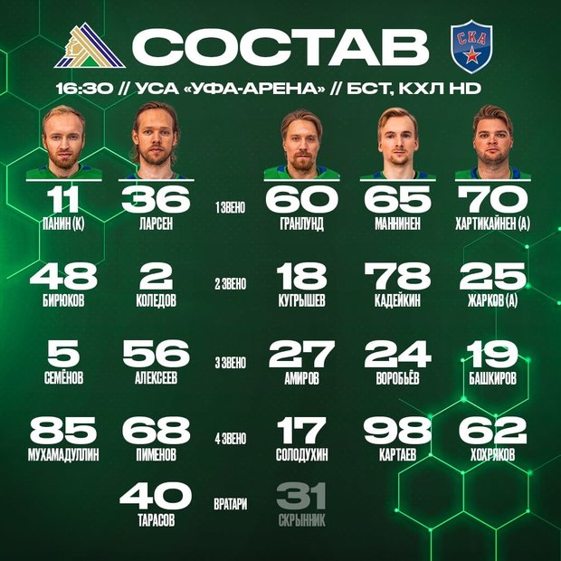 В заявке на игру не оказалось нападающего Никиты Сошникова. Вместо него в третьем звене уфимцев сыграет молодой Родион Амиров.