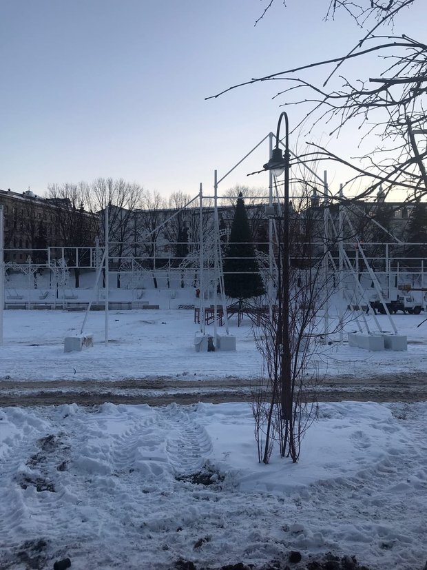Новогодняя елка в парке «Черное озеро» переехала. Главный символ праздника устанавливают не в привычном месте, а посреди катка.