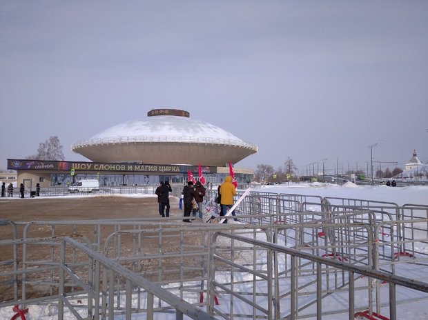 Сейчас на площади Тысячелетия идет подготовка к митингу, который начнется в 12 часов. Огородили участок перед цирком, туда проходят через рамку. Из динамиков стадиона звучит веселая музыка и голос аниматора, который командует танцевальные движения.