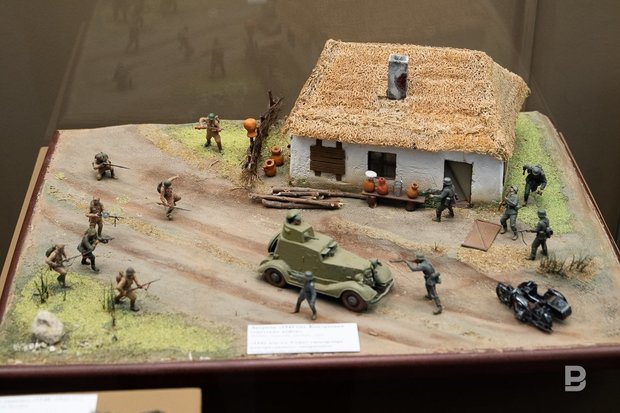 В Музее естественной истории Татарстана в эти дни проходит выставка «Великая Отечественная война и Вторая мировая война в миниатюре». В экспозиции 12 диорам — композиций, связанных единой идеей, сюжетом и антуражем, а также виньетки и просто отдельные образцы военной техники, не только советской, но и немецкой: самолеты, танки, пушки и корабли, а также авторские фигурки солдат. Все они выполнены в масштабе 1 к 35.