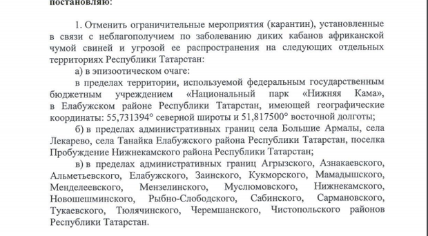 В Татарстане на нескольких территориях отменили карантин, который ввели в связи с неблагополучной ситуацией по заболеванию диких кабанов африканской чумой свиней (АЧС). Соответствующий указ 10 июня подписал президент республики Рустам Минниханов.