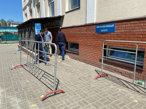 Люди, ожидающие очереди на улице, старались спрятаться в тени от жары. На территории паспортно-визового сервиса был разбросан мусор. На улице стоят машины, в которых мигрантам предлагают помощь с переводом, оформлением страховки и сдачей экзаменов по русскому языку.
